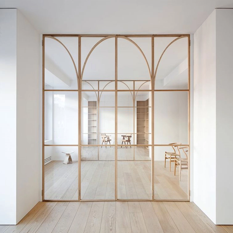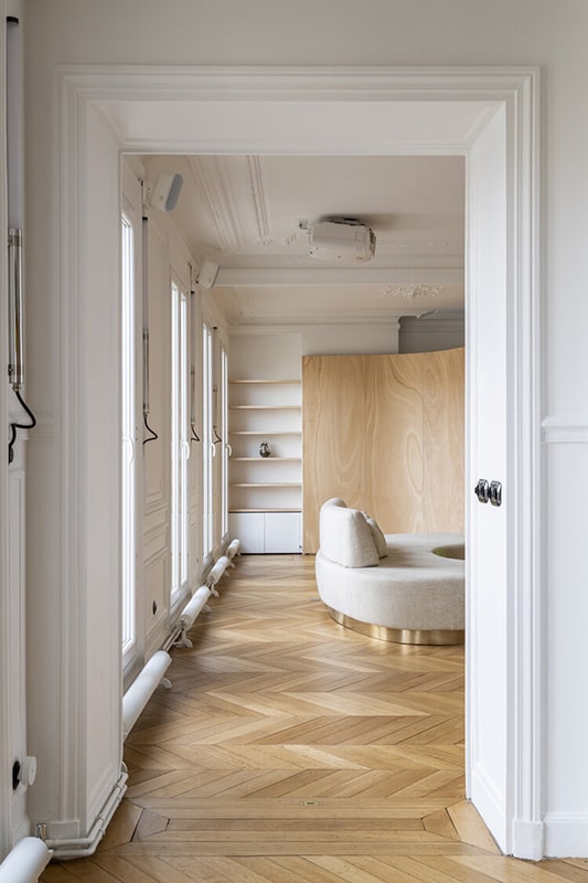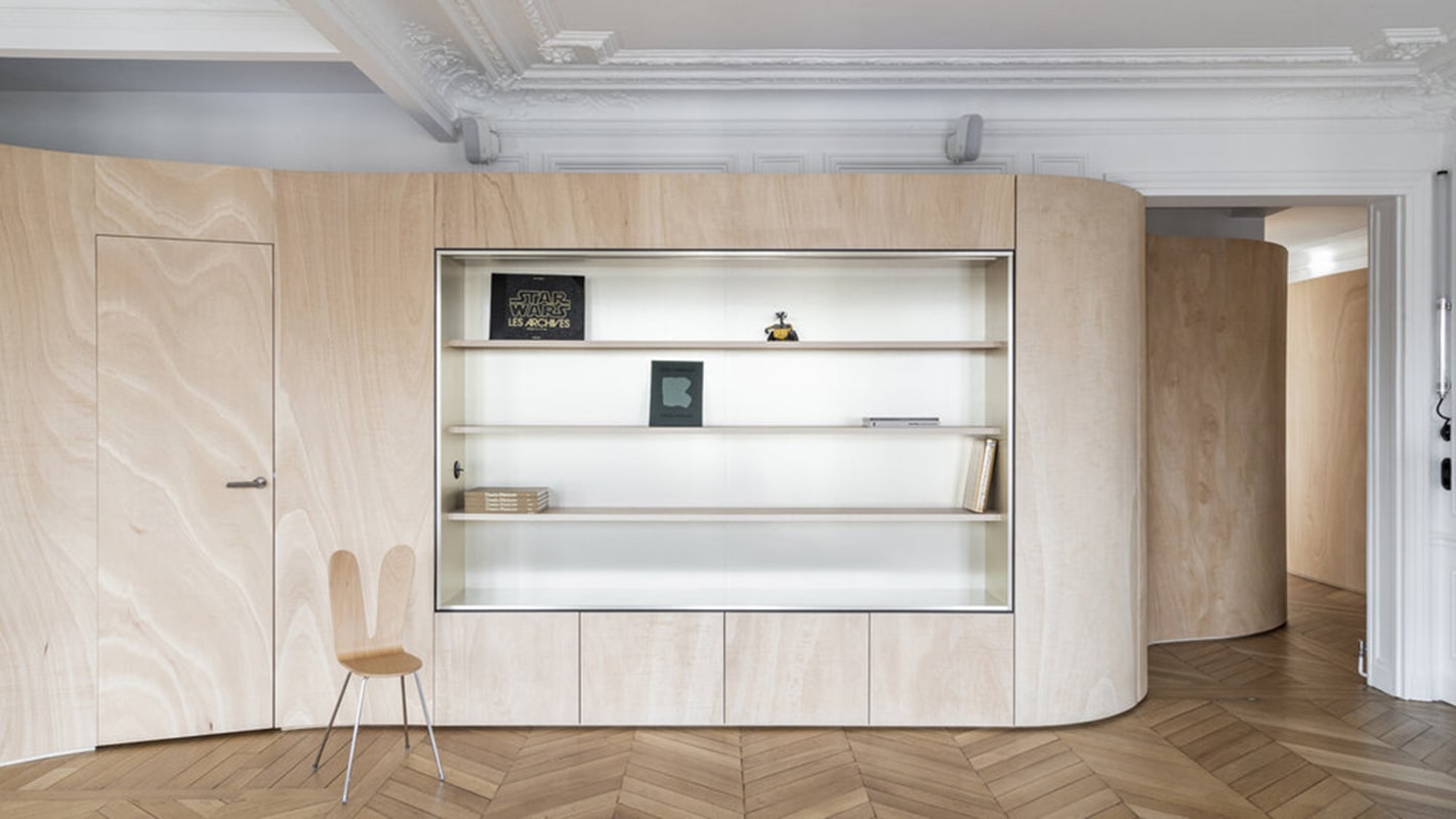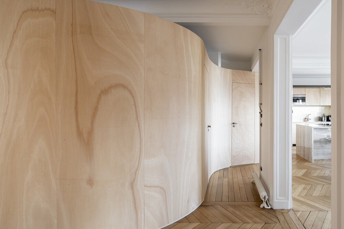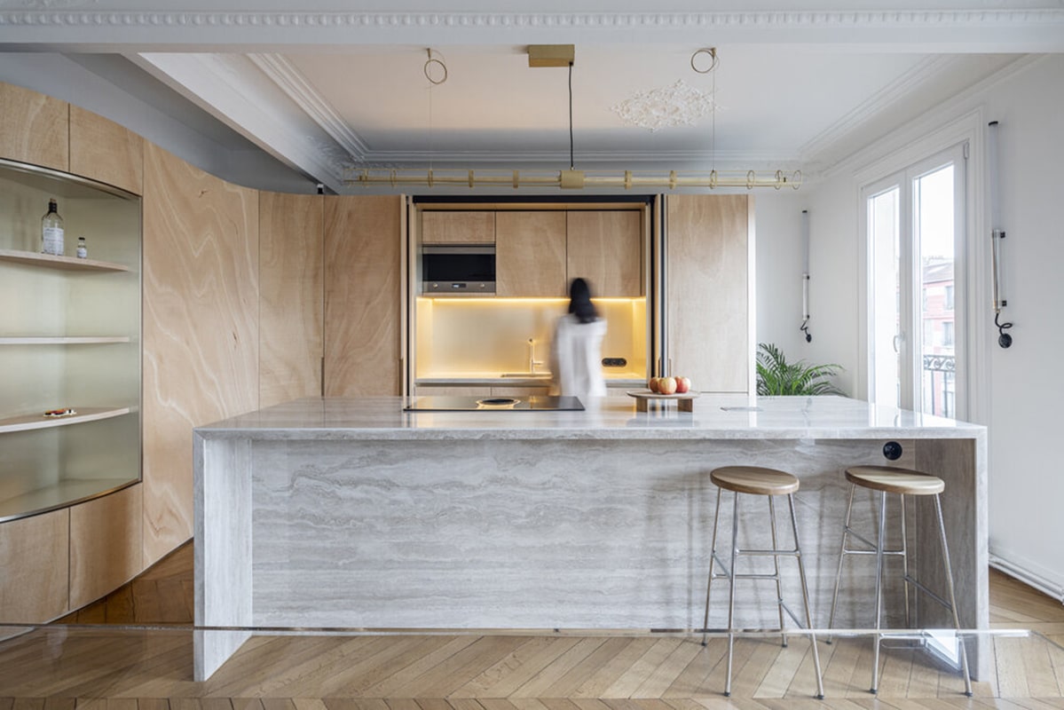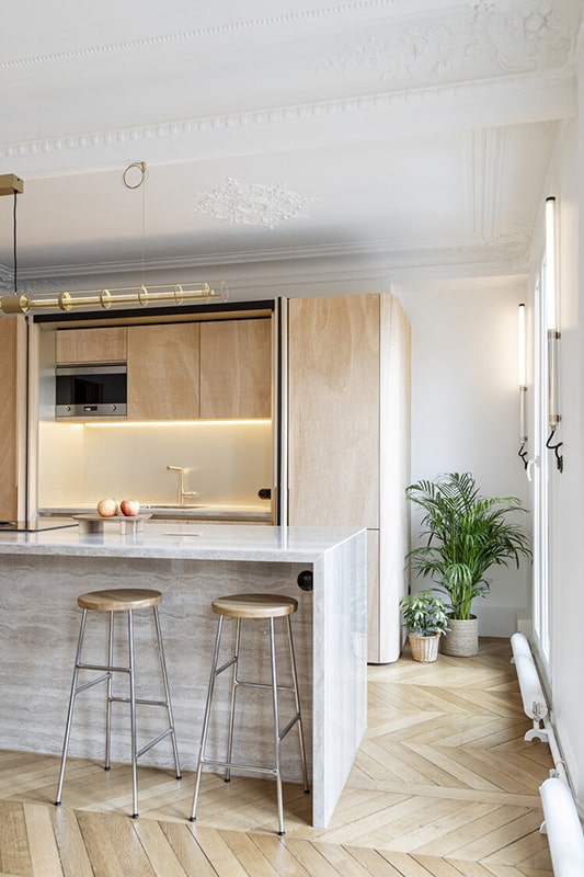 Le plan de cet appartement est très ouvert et les espaces reliés entre eux par des panneaux de bois sur mesure dissimulent des pièces comme des rangements, associés à un plafond à poutres apparentes qui ajoutent de la chaleur à l’espace.